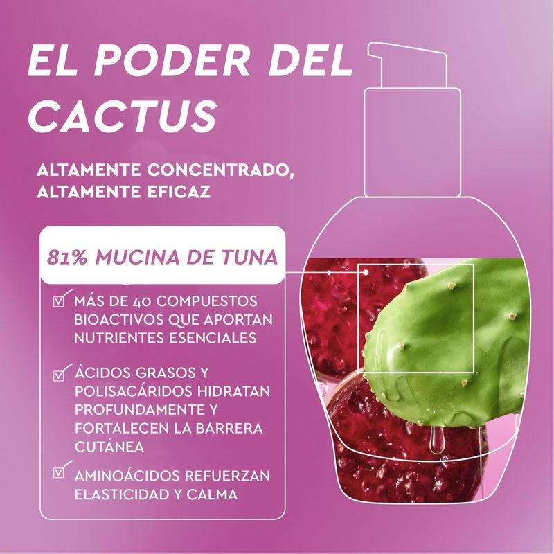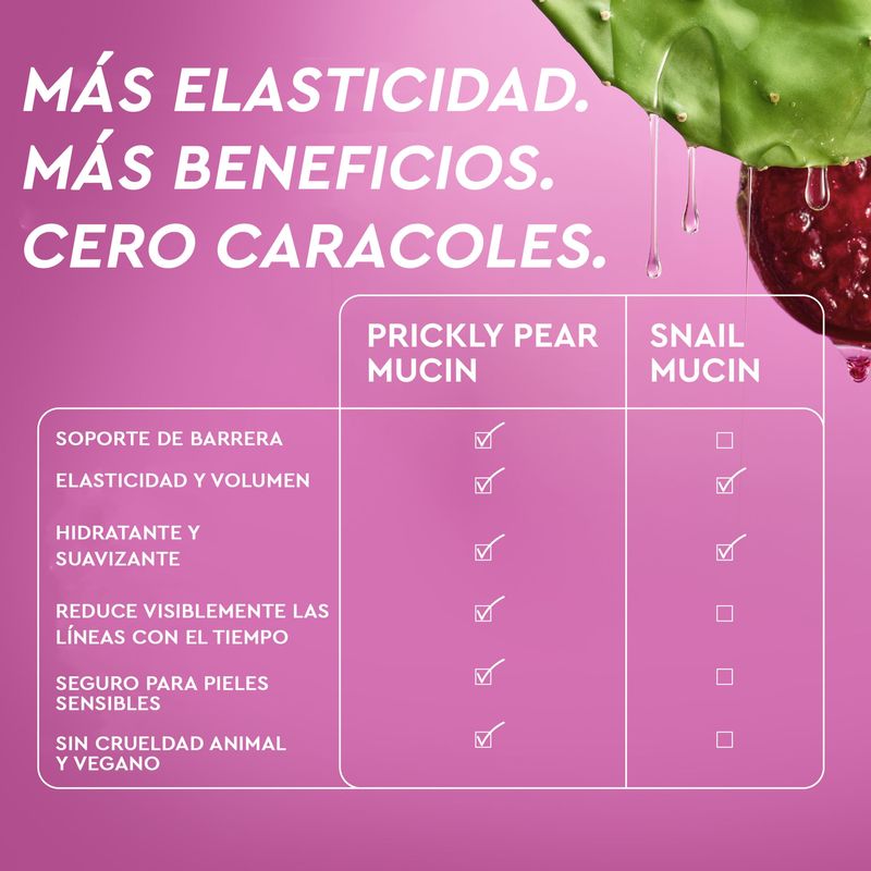 Una esencia vegana e hidratante de Mucina derivada de Cactus (81%) y Péptidos Bioactivos para una piel suave, elástica y resistente. Al igual que el "Prickly Pear Cactus", que crece en las condiciones extremas del desierto almacenando agua y nutrientes para mantenerse elástico y resistente, este suero logra aportar los mismos beneficios; mejorando la elasticidad, la hidratación y la barrera cutánea de la piel.