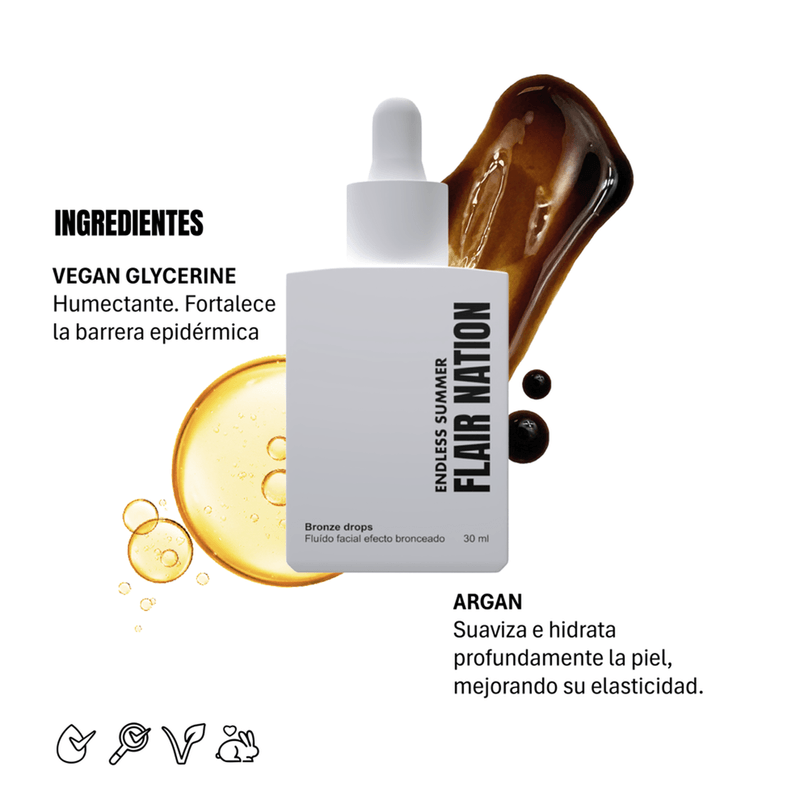 Un suero iluminador con efecto bronzer que aporta un un toque playero en tu piel. Está formulado con Glicerina Vegana y Aceite de Argán, que aumentan la hidratación de la piel, mejoran la elasticidad y aportan suavidad. Su textura ultraligera y construible, se funde en todos los tipos de piel.